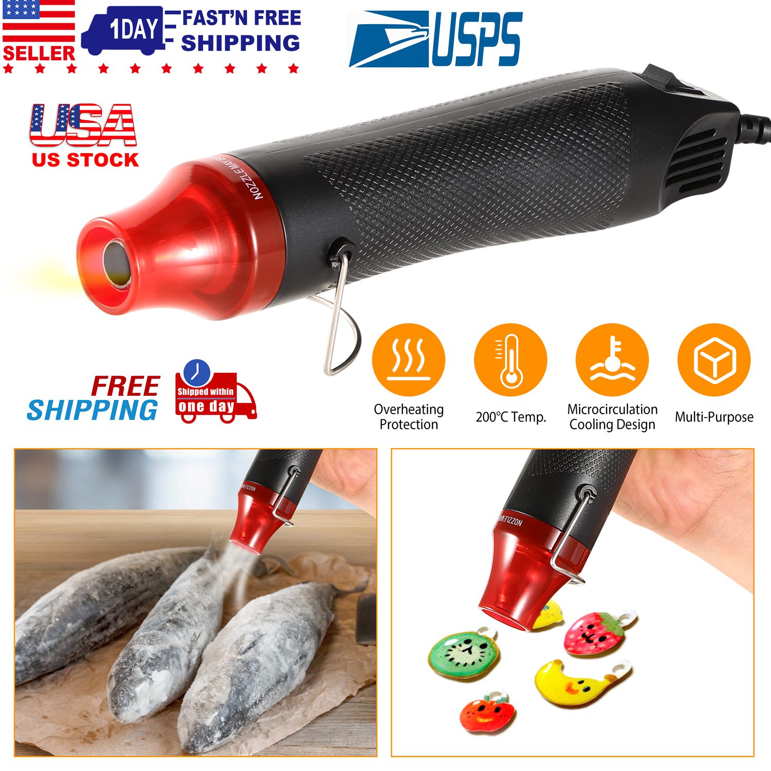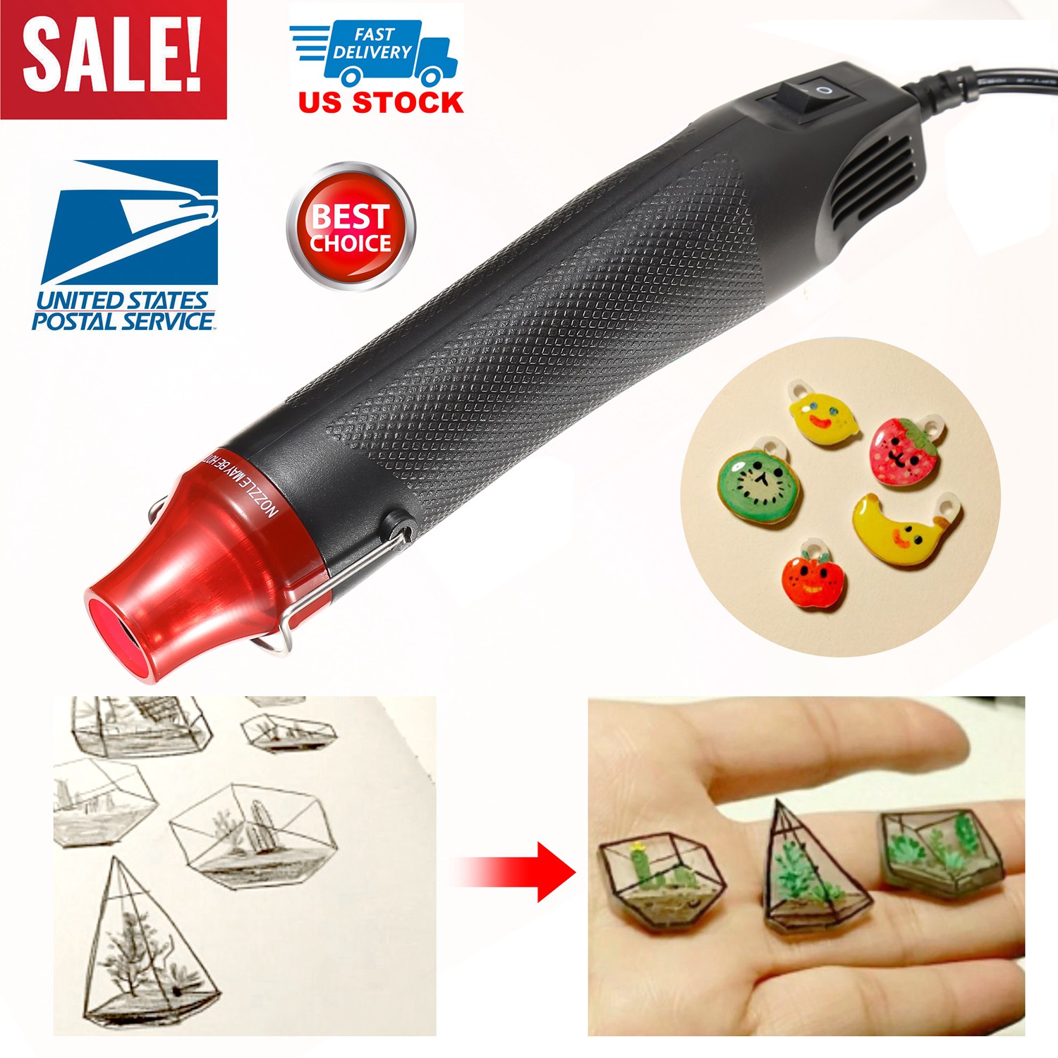 This excellent compact electrical hot air gun can be used for heating shrinkable film, embossed powder, rubber stamp, heat shrink tubing, fast-drying paint & glue, etc. The polymer clay will become hard and bright after heating by this gun, which is the best companion for crafts. Made of premium ABS plastic exterior and stainless steel interior, which is safe for use. And easily heats up to 200°C/392°F in seconds, then, you are able to make crafts with this hot air gun. Meanwhile, due to its 100-degree retractable stand design, you are also supposed to hands free to complete your DIY projects.