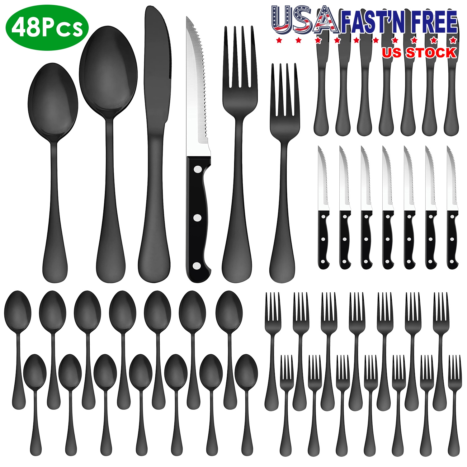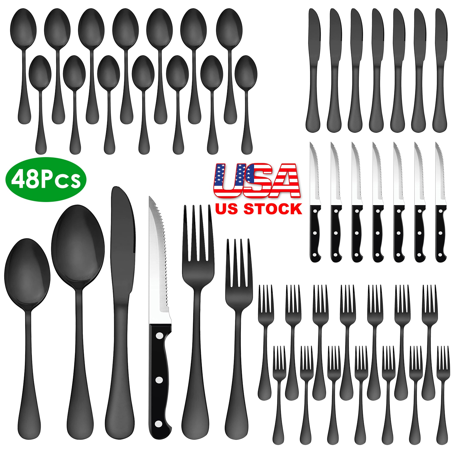 Our 48Pcs Silverware Set including 8 dinner forks, 8 salad forks, 8 dinner knives, 8 steak knives, 8 dinner spoons and 8 tea spoons, able to serve for 8 people, is great for family daily use, entertaining guest, wedding or other occasions. Made of 410 stainless steel and processed with vacuum electroplate technology, it's smell-free, rust-resistant, sturdy, not able to bend, and with smooth edge which makes you use it without worry. It's dishwasher safe, and easy to clean. Rose gold/ silver/ black colors are optional, perfect gift for your friends, newlyweds or new homeowners in Thanksgiving Day, Wedding, Party and events.