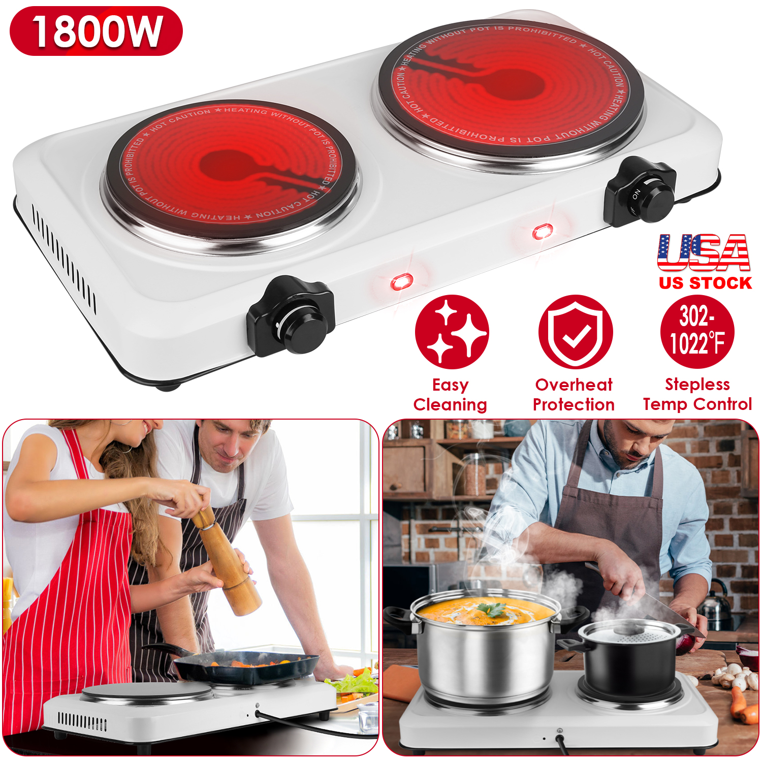 This compact infrared dual burner is great for events and traveling! The lightweight and compact design allows for easy storage and carrying. The hot plate burner with special infrared technology distributes heat quickly and evenly for great performance at 302-1022℉ stepless adjustable temperature. 7.5in-Diameter & 6.3in-diameter glass heating plates make it suitable for most cookware with diameter≤7.5in/6.3in, such as frying pans, woks or stovetop teapots made from aluminum, stainless steel, iron, glass, etc.. Perfect for camping, student accommodation, holiday homes, caravans, campers, offices or as an extra cooking surface in a busy kitchen. A sleek clean black finish adds style and a sleek appearance to this wonderful kitchen addition!