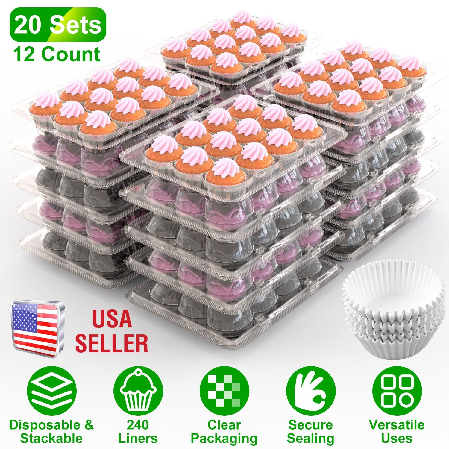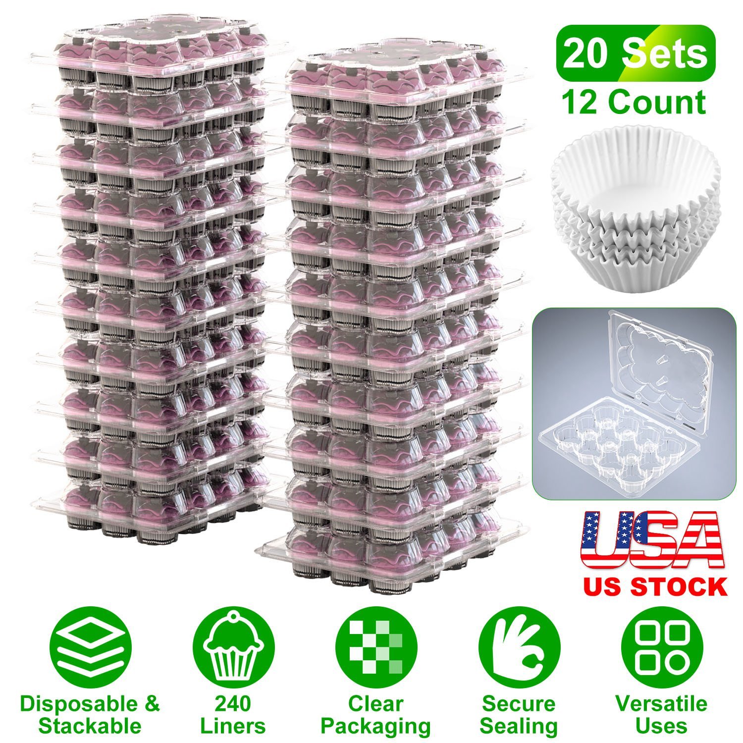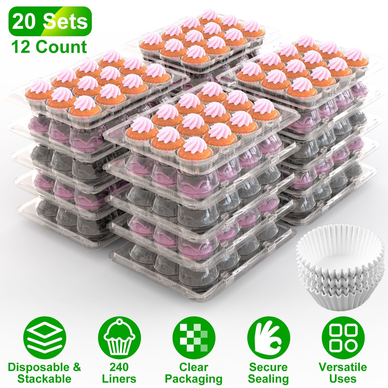 Pack or display your delicious dessert treat with our disposable cupcake containers! Come with 20 sets of 12 count cupcake boxes and 240 cupcake liners, clear and stackable, ideal gifts or showcase for bakeries, supermarkets, cupcake shops, and cafes, and for weddings, baby showers, birthday parties, holiday celebrations, anniversaries and other parties. Each cupcake carrier features a interlocking system that keeps your cupcakes intact, including 4 lock tabs, 2 inside funnel-shaped cones and the high dome lid. Suitable for a variety of cakes, cupcakes, cookies, donuts, macaron, muffins, fruits and other foods.