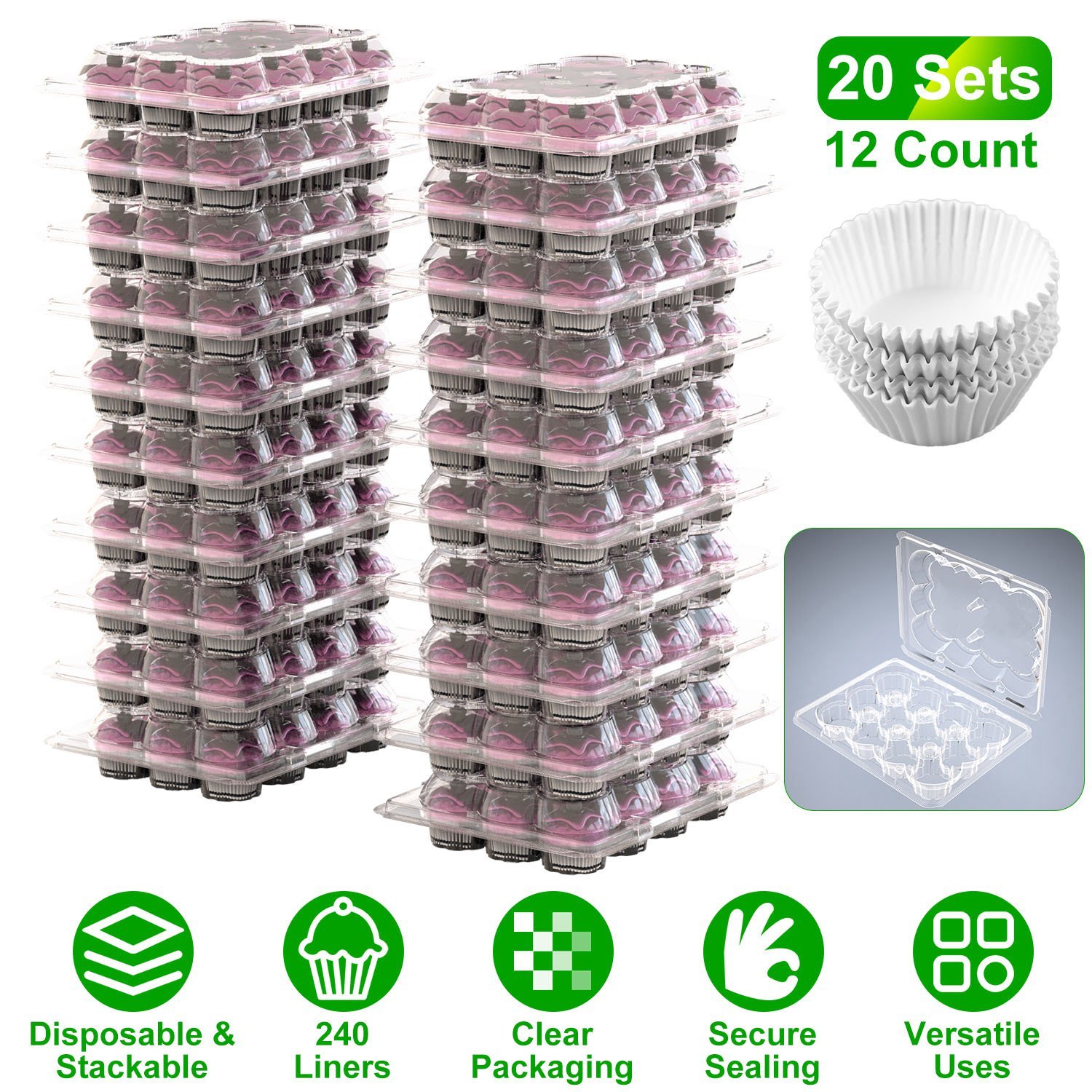 Home > 12 Count 20 Sets Clear Cupcake Boxes Disposable Cupcake Containers Stackable Cupcake Carrier Holders with 240 Liners High Dome Lid