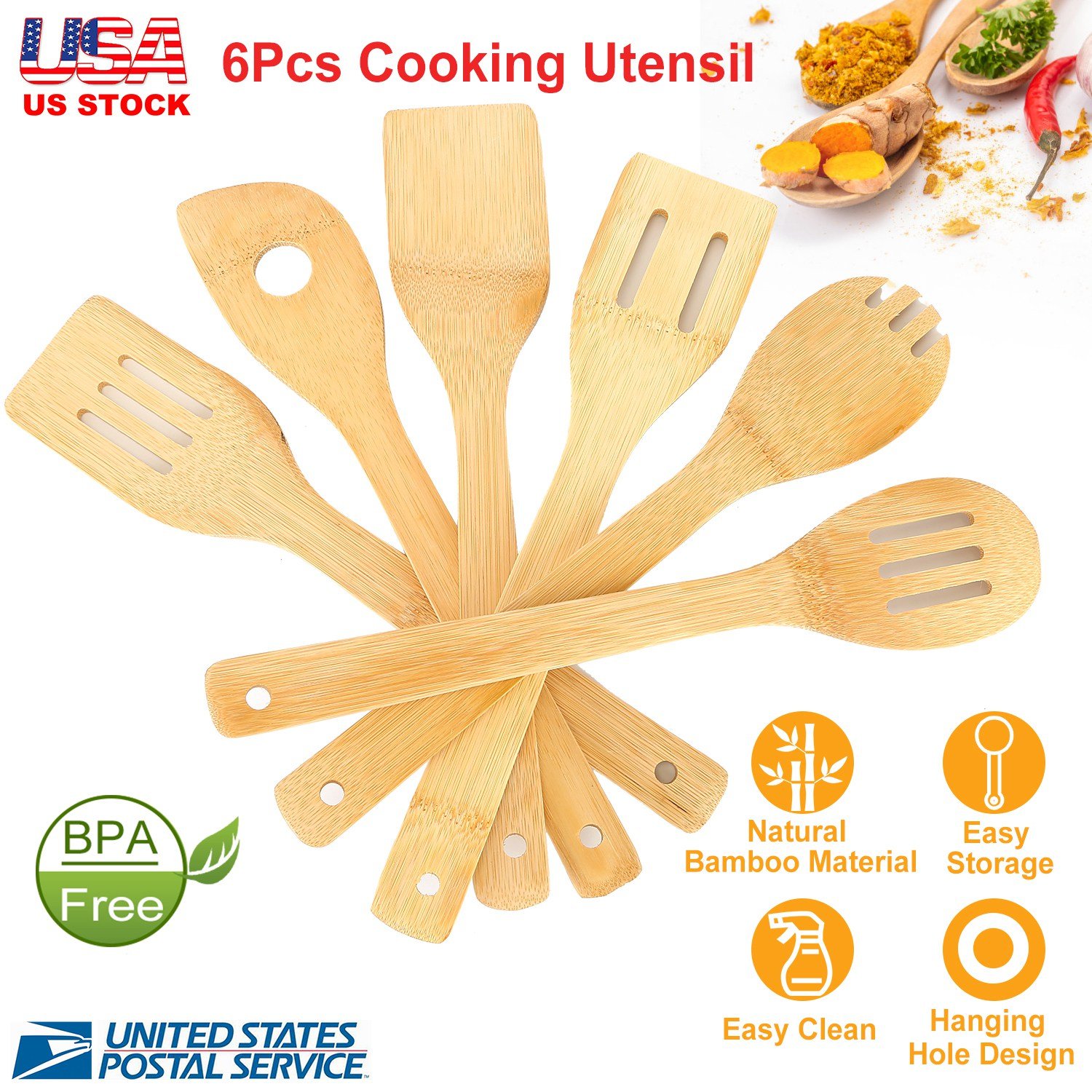 Applied with the natural bamboo material, a hang-up hole, and 6 different types of spoons and spatulas, this sets of kitchen cooking utensil suits for your various cooking needs and can be easily stored and cleaned. The natural, heat-resistant and durable bamboo material also makes it an appropriate cooking tool. It can also be considered a useful gift for your friends and family.