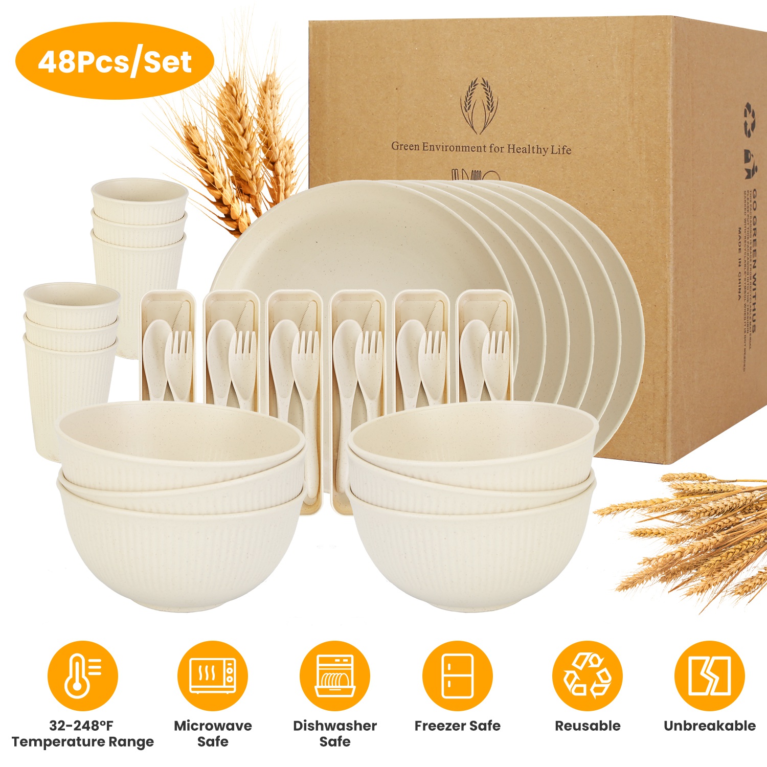 Home > 48Pcs Wheat Dinnerware Set Reusable Plastic Dinnerware Set Service for 6 Unbreakable Kitchen Cups Plates and Bowls Sets Dishwasher Microwave Freezer S