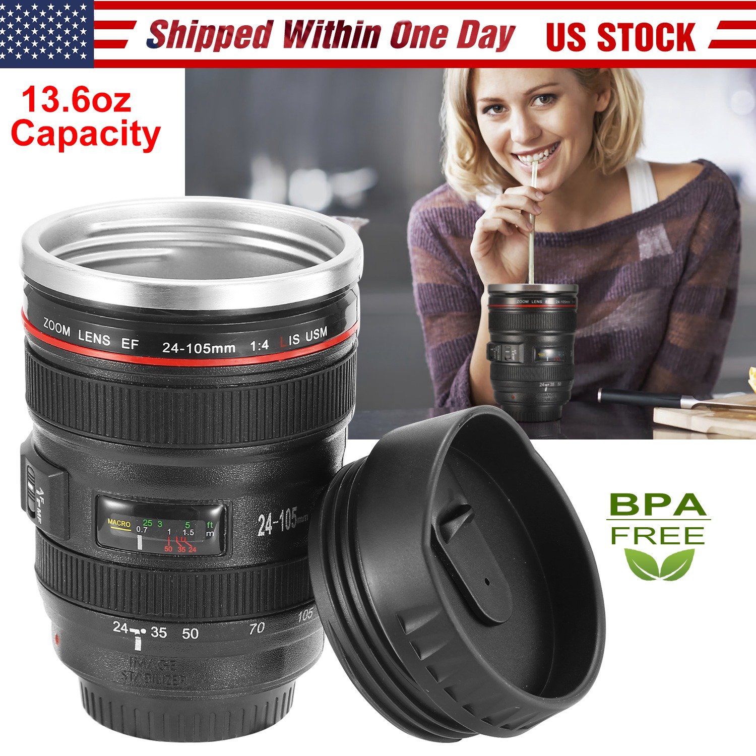 Our camera lens mug is a simulation to Camera Lens Model EF 24-105mm f/4.0L USM Lens with clear and anti-fading camera lens shape, which makes it a must-have collectible and amazing gift for die-hard photography fans and camera gurus. Made of food-grade ABS plastic materials and high-quality stainless steel inside, which is BPA-free and safe to use for drinking. With up to 400ml/13.6oz capacity and insulation function, coffee mug is great for outdoor activities instead of using disposable poisonous cups. Moreover, it’s also practical to use as a cup, ashtray, money box and pen holder!