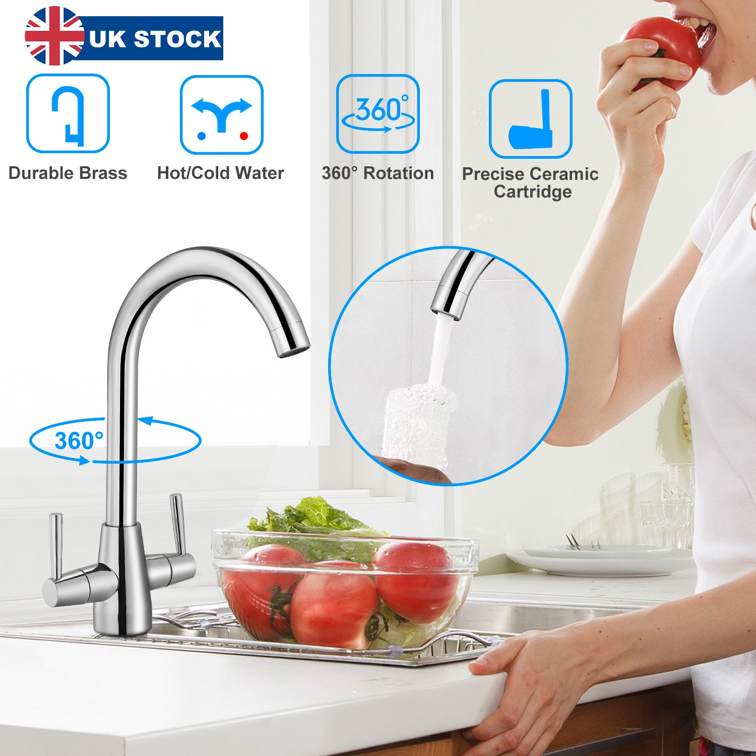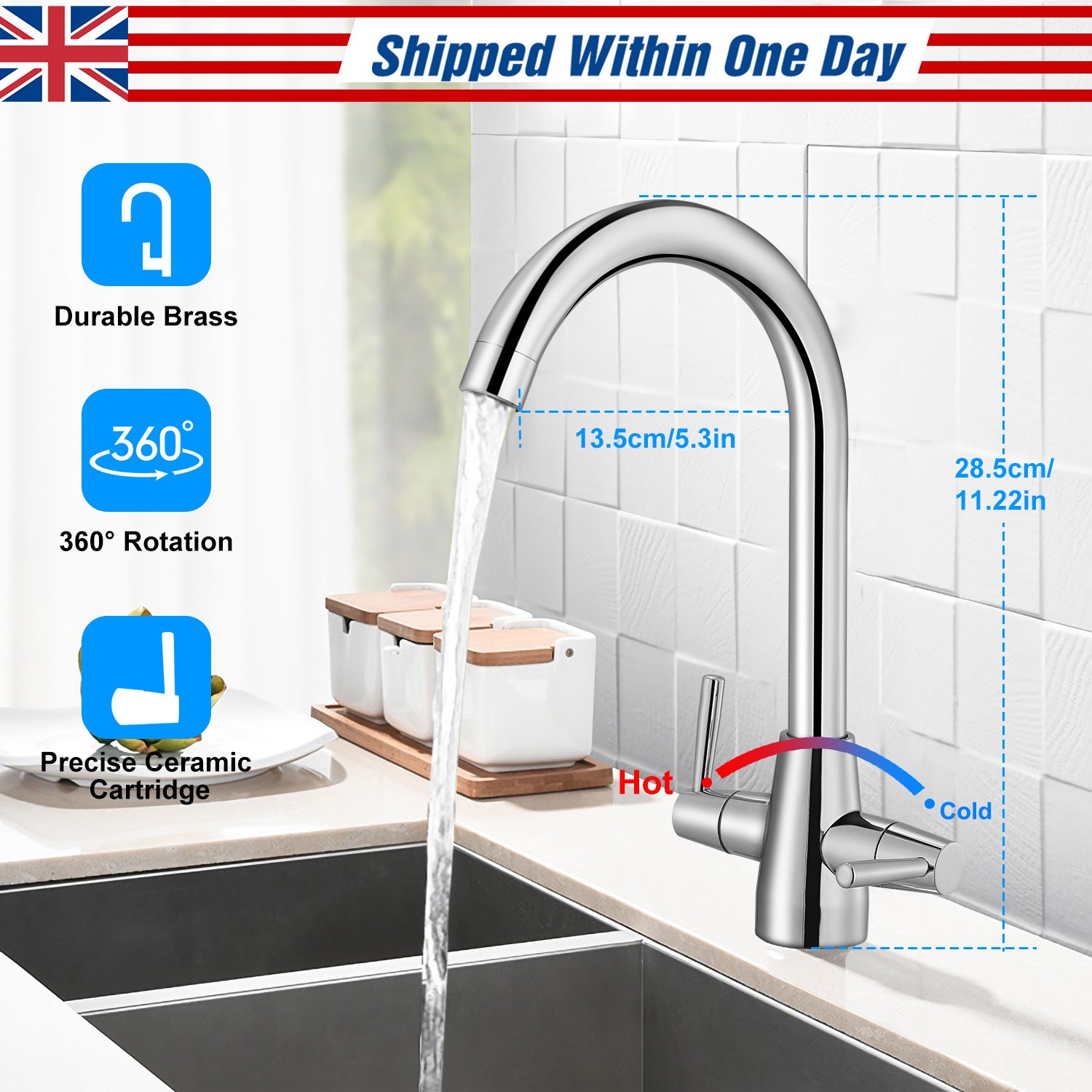 Kitchen Sink Faucet Two Handle One-Hole Basin Hot Cold Mixer Tap Brass Construction Chrome Finish UK Standard