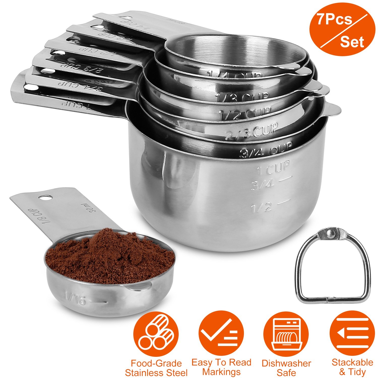 Measuring cups are truly essential cooking utensils, as they help to ensure that you add the ideal amount of every ingredient for perfect results out of the oven or off of the stove top. Our measuring cup set includes 1/8, 1/4, 1/3, 1/2, 2/3, 3/4 and 1 cup. Permanent, etched measurement makings, they will be not easy to fade or wear off, so you'll always know which size is which. D-rings for easy and compact storage and they can be easily hung anywhere. Easy-to-clean and no gaps for bacteria, our measuring cup set is an optimal gift for house warming.