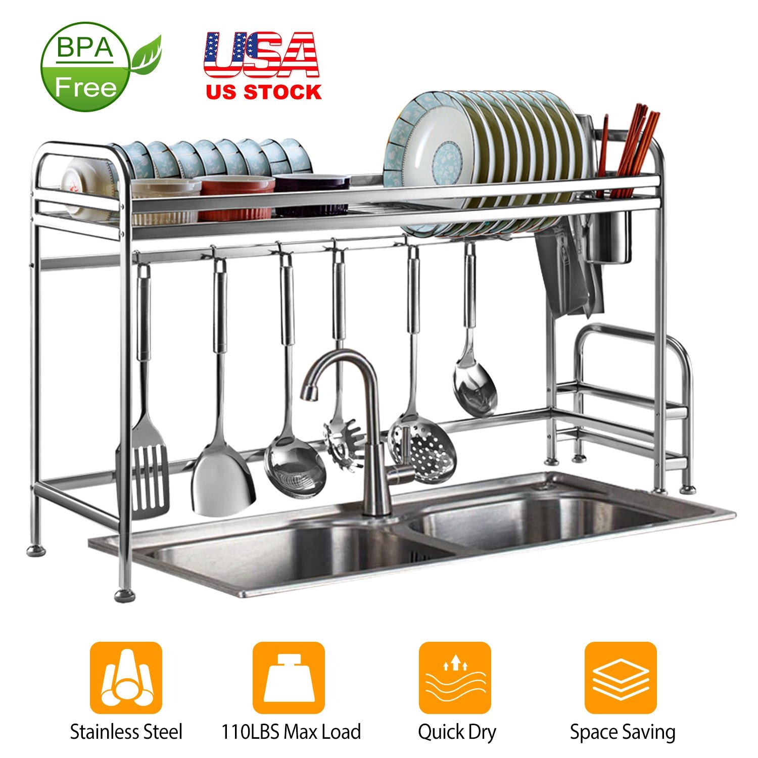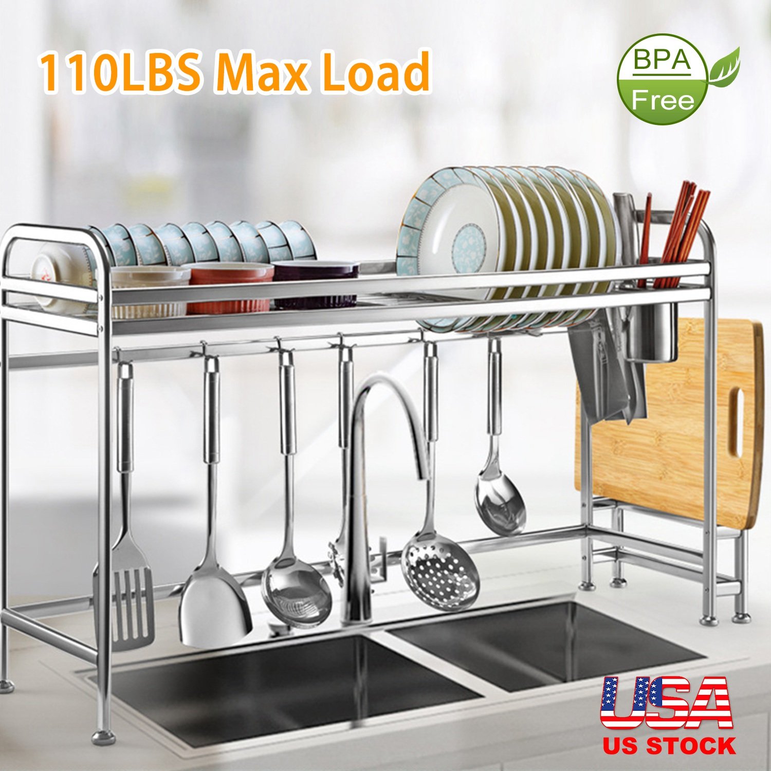 Over Sink Dish Drying Rack Shelf Stainless Steel Kitchen Countertop Bowl Dish Chopping Board Organizer Rack w/ Cutlery Holder