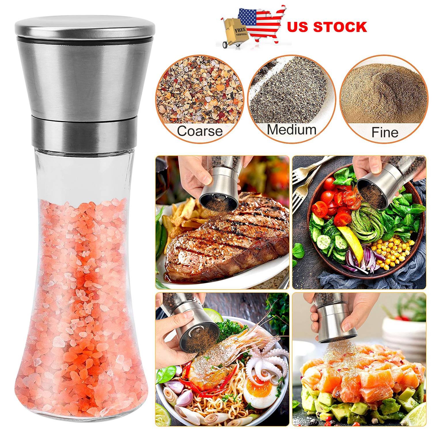 Home > Stainless Steel Salt Pepper Grinder Tall Glass Sea Salt & Pepper Mill Shaker w/ Adjustable Coarseness