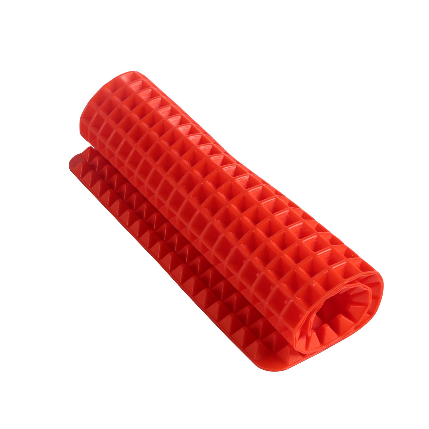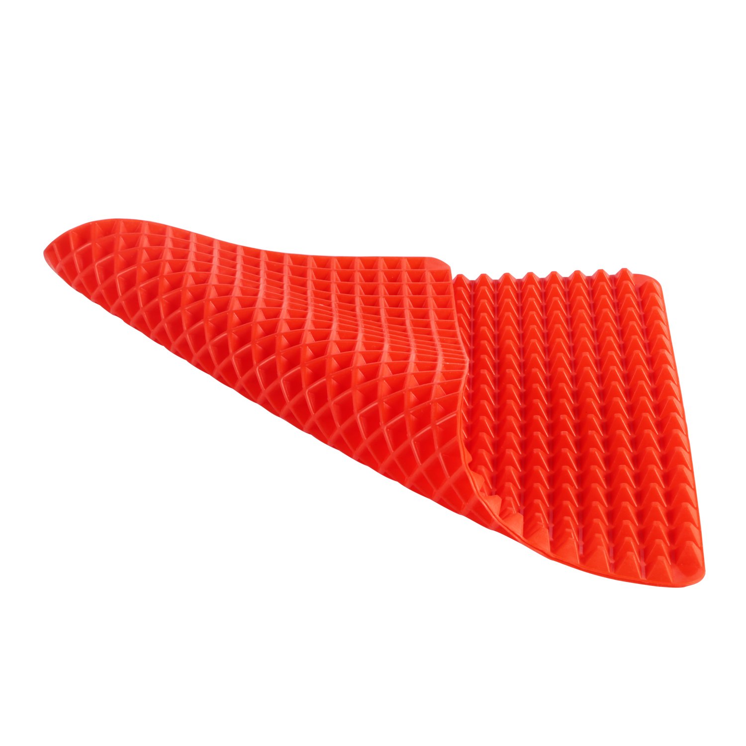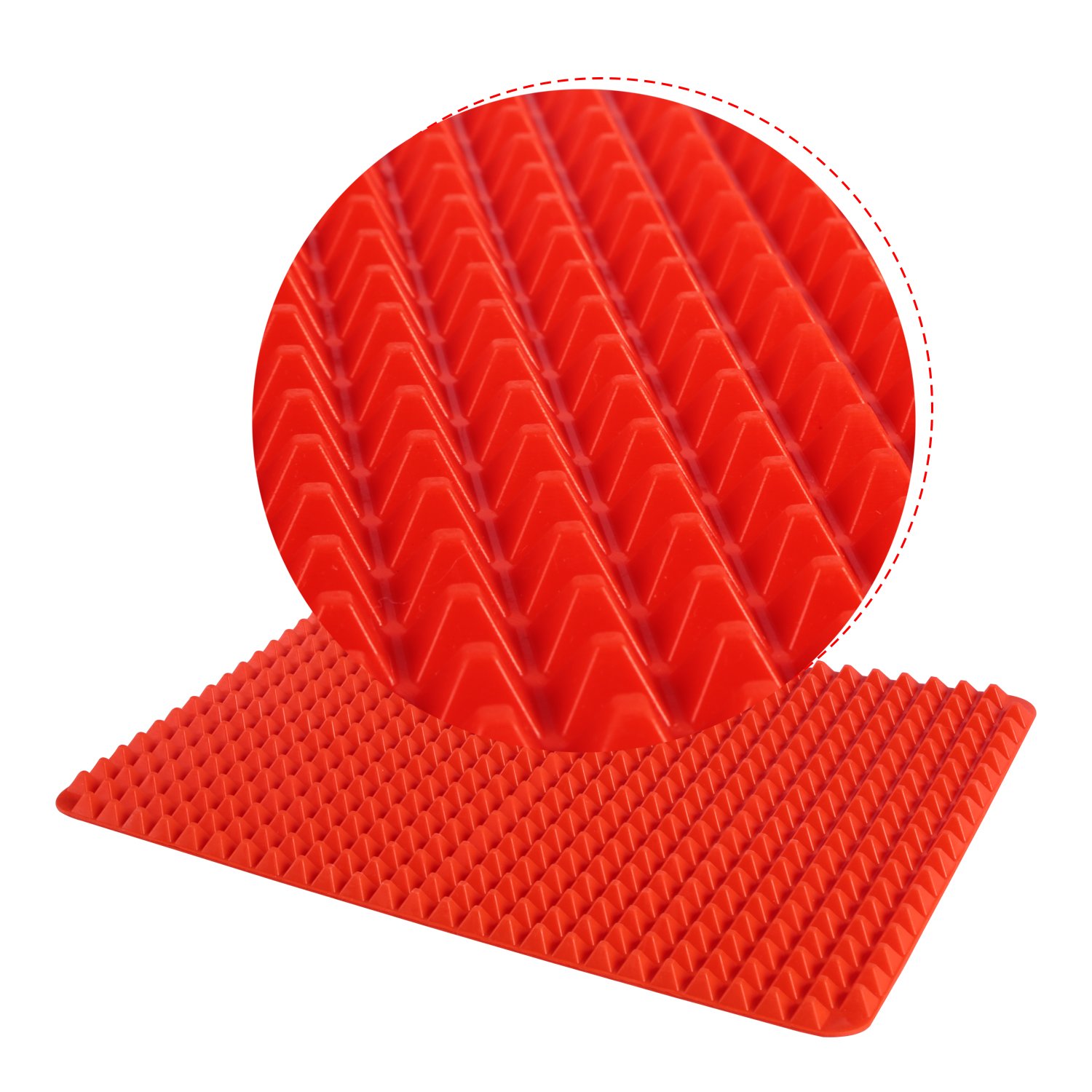 This non-stick cooking tray sheet provides a way to cook healthy meats and be a better cook. Being placed atop a pan while cooking or baking, those pyramid-like bumpy ridges help draw oils and enhance heat flow, browning without having to turn, which allows the food to be crisper. In order to fit different baking sheets, you can simply cut this mat down to your ideal size. After use, you can either hand wash it in hot soapy water or throw it in dishwasher for clean.