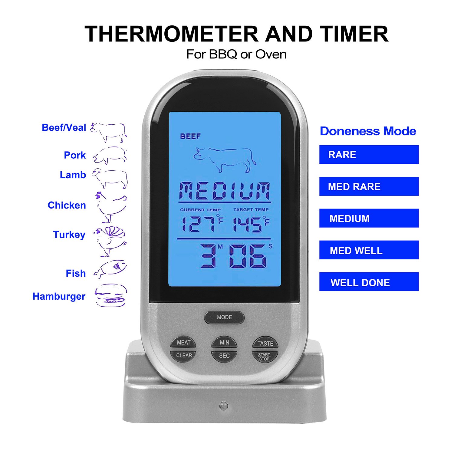 The digital meat thermometer includes a receiver with large backlit LCD and a transmitter with a stainless steel probe, which can offers a 98ft/30m wireless monitoring and operation. It supports test and monitors 8 type of meat and 5-level taste, you can free choose from the included meat type and level of tastes as your will without any worry, because the thermometer will alert you when the meat temperature reaches to pre-set parameter. Moreover, its timer function allows you to set up cooking time. It is a useful tool for BBQ, smoking meat or cook use.