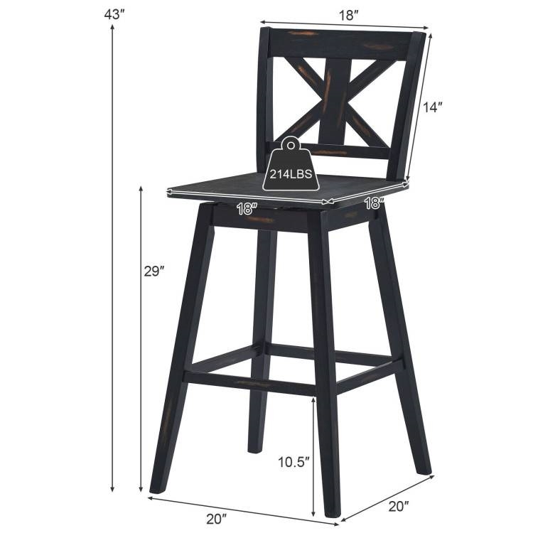 This Set of 2 Black Wood 29-in Modern Kitchen Dining Farmhouse Swivel Seat Barstools is made of premium rubberwood and features excellent sturdiness and durability. Therefore, the overall weight capacity of each bar stool has been improved to 214 lbs and you can use the set for a long time. The backrest is designed to be ergonomic and can perfectly fit your back lines. Meanwhile, the seat of the barstool also adopts a curved design, fitting your hips. In this way, your body will be well supported and fatigue can be relieved. Even sitting for a long time you will not feel very tired. The special thing is that the seat is a 360° swivel and you can spin quietly. Thanks to this feature, you can talk to your guests in different directions conveniently. Moreover, there are 2 bar stools in this set, which can meet your daily needs. In addition to your home kitchen, the bar stool set can also be placed in restaurants, bars, and bistros. Meanwhile, with a vintage design, the bar stools can also become a wonderful decoration. The set will bring a sense of fashion and freshness to your home. All needed manuals and accessories are included in the package. With these necessary tools, you can easily assemble the bar stool set. The overall dimension of each stool is 20" x 20" x 43" (L x W x H) and the seat is 29" high. During daily life, you only need to wipe it with a damp cloth regularly.
