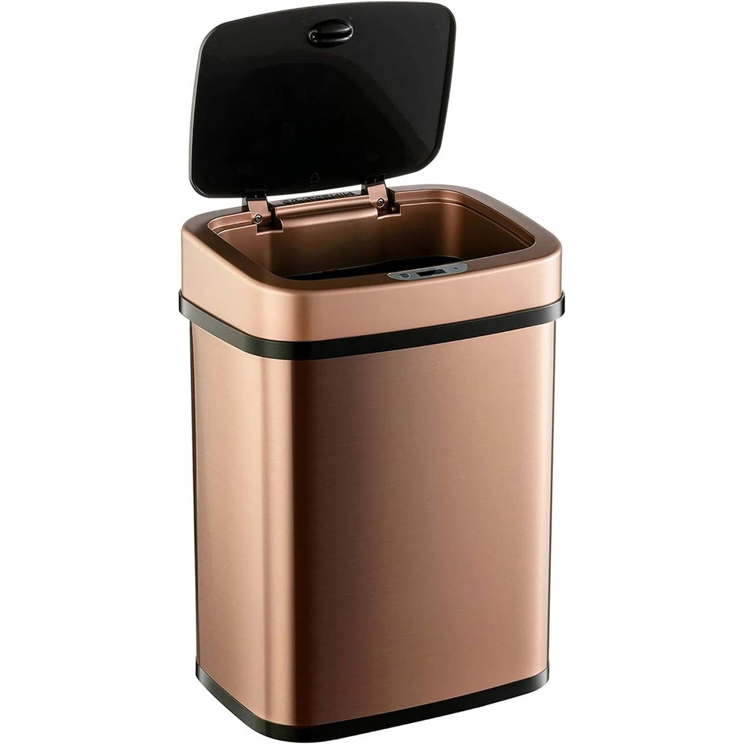 This 3-Gallon Copper Rose Gold Stainless Steel Trash Can with Motion Sensor Lid has a hands-free lid that opens with a simple wave of the hand. The advanced infrared technology preserves battery life, and it is also made of commercial-grade fingerprint resistant stainless steel. The trash can's small, sleek design is convenient and can handle your household needs with ease.Water-resistant Infrared motion sensor prevents moisture or any accidental spills from damaging the unit. Delay sensing technology preserves battery life and prevents any unnecessary opening from pets, children, or walking by. Seal odor in and eliminate cross-contamination of germs. Requires 2 AA batteries (not included), alkaline battery highly recommended for best performance. Removable ring liner holds trash bag sturdy in place and prevents bag from overhanging for a neat and clean appearance. Use any standard trash bags.